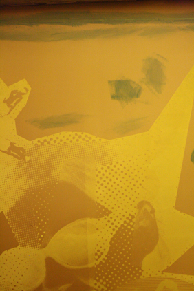 Acetate film has been taped from one side under the screen to print the image and therefore register the paper that has been printed with a previous colour. It can then be folded clear when the paper is in position.