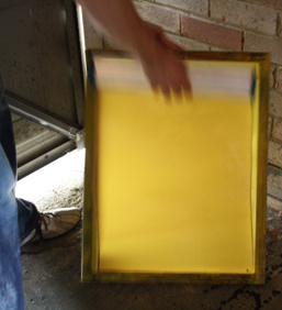 A hairdryer works well to dry the screen if you’re impatient! To coat the screen with the photo sensitive emulsion you must be in dim or blacked-out light because you want to prevent any UV exposure from sunlight or UV emitting light bulbs which will harden the emulsion on the screen. I find that a dim orange light bulb gives me just enough light to see what I’m doing.