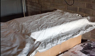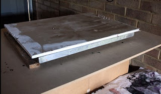 Screen laying on wood blocks covered with board to dry