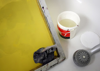 The screen is degreased in the bath using a rag covered in the degrease paste. Always use safety equipment described above.