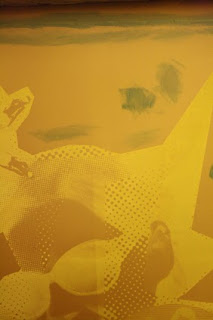 Image showing half of the original stencil removed with the use of diluted strip liquid and a pan scrubber. Always use the safety equipment described above!