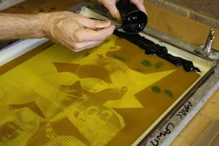 All 4 edges of the screen need to be taped with masking or gum tape to make sure no ink seeps through to your substrate (paper) from the screen edges. Attach the screen to your hinges on your printing table and make sure you have your paper stock within arms reach. You’ll also need your sponge, inks, rags and a spatula.