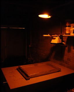 Once dried, the board and blackout material is taken away under a dim orange lamp.